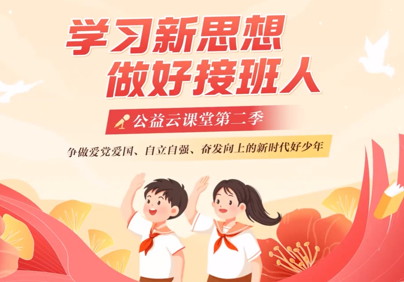 “学习新思想 做好接班人”主题公益云课堂第二季紧扣立德树人根本任务,立足青少年成长规律,聚焦理想信念涵养与核心价值塑造。课程从百年党史中汲取奋进力量,在科技创新中点亮未来梦想,于劳动实践中锤炼坚韧品格,以榜样故事激扬青春担当,帮助青少年树立正确的世界观、人生观和价值观。