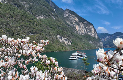 碧水青山、绝壁古镇、吊脚悬楼、如织游人与烂漫春花相映成景,构成一幅美丽的生态画卷