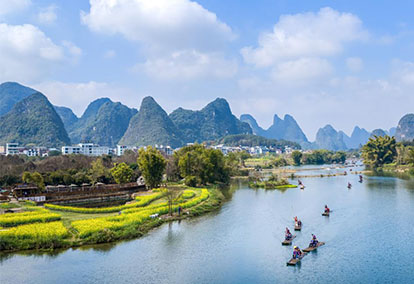 西壮族自治区桂林市阳朔县鸡窝渡村遇龙河畔油菜花开,春意盎然,游客乘坐竹筏畅游遇龙河,欣赏两岸山水田园风光